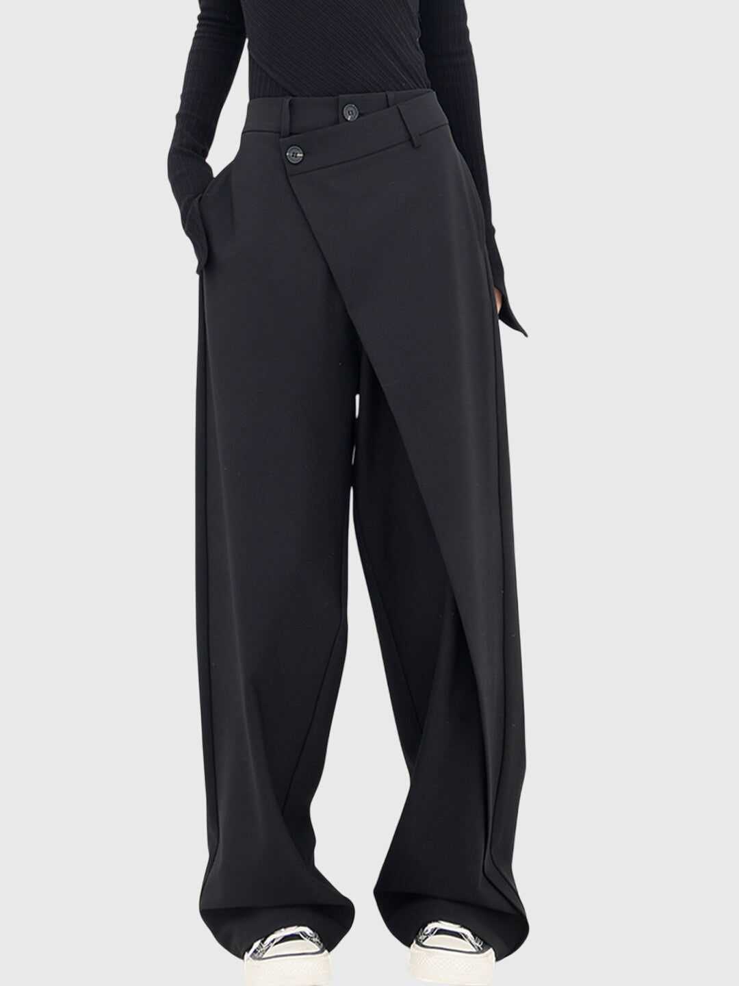 Designed to create a flattering silhouette that enhances your figure. With their unique asymmetric waist and modern baggy fit, these trousers offer a striking yet versatile option for those who appreciate bold fashion choices. Perfect for both casual outings and more sophisticated occasions.