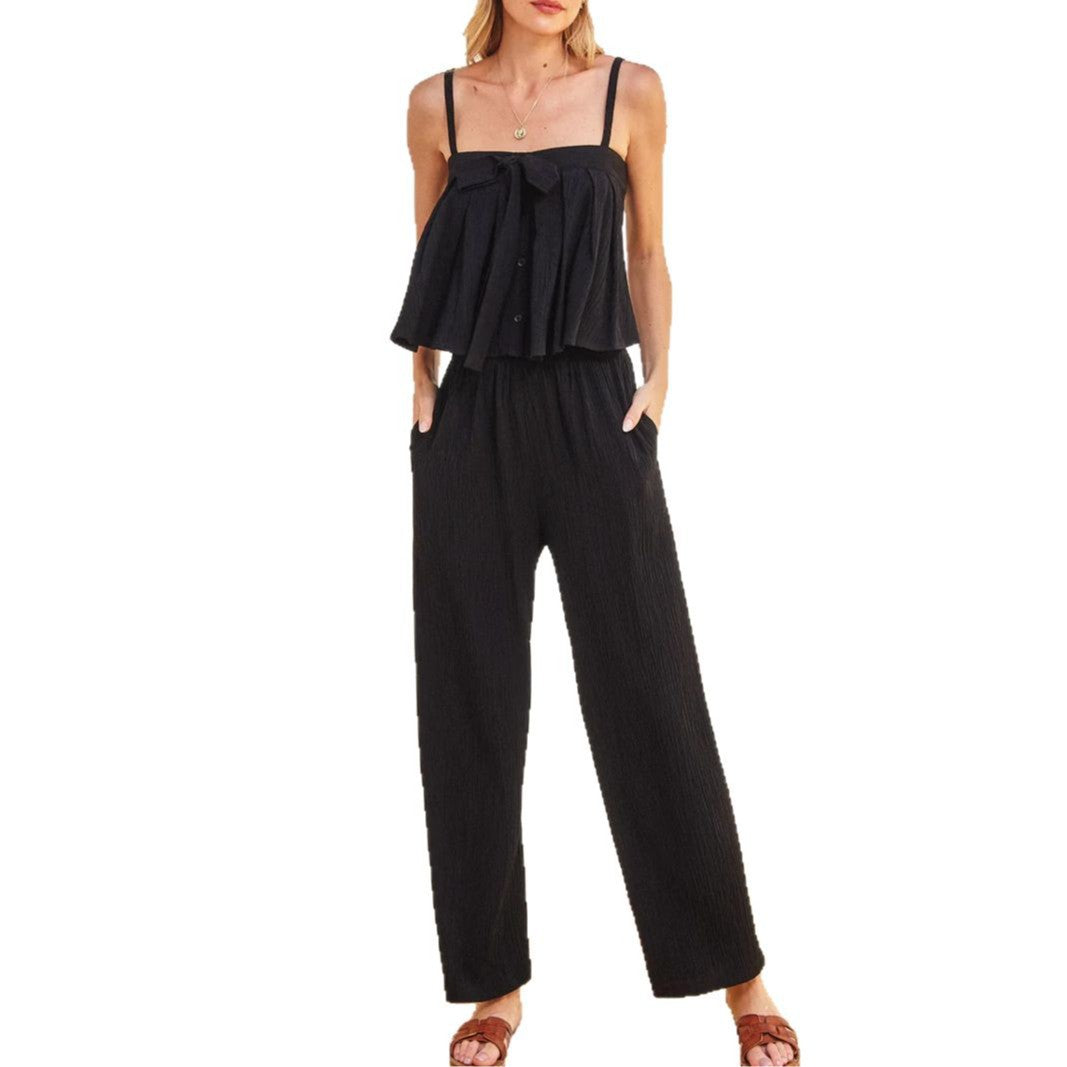 Capture laid-back sophistication with the Ariana Relaxed Fit Wide-Leg Jumpsuit, designed for effortless style wherever the day takes you. Its breezy silhouette, flattering tie-front detail, and delicate shoulder straps create a light, feminine feel that's perfect for sun-soaked afternoons or casual outings. With a graceful wide-leg cut, the Ariana brings comfort and charm to every occasion.