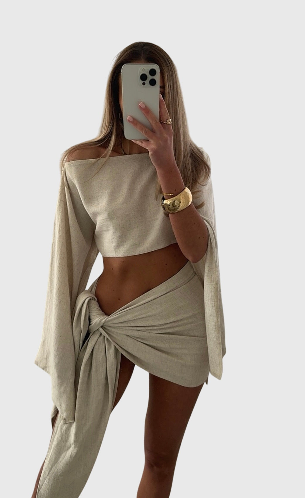 Channel sun-soaked energy in the Boudica Sahara Muse Set — a head-turning duo crafted for balmy escapes and golden-hour gatherings. With its fluid wrap design and breathable fabric, this two-piece offers ease and shape in perfect balance. From coastal getaways to terrace cocktails, this look carries heat in the most stylish way.