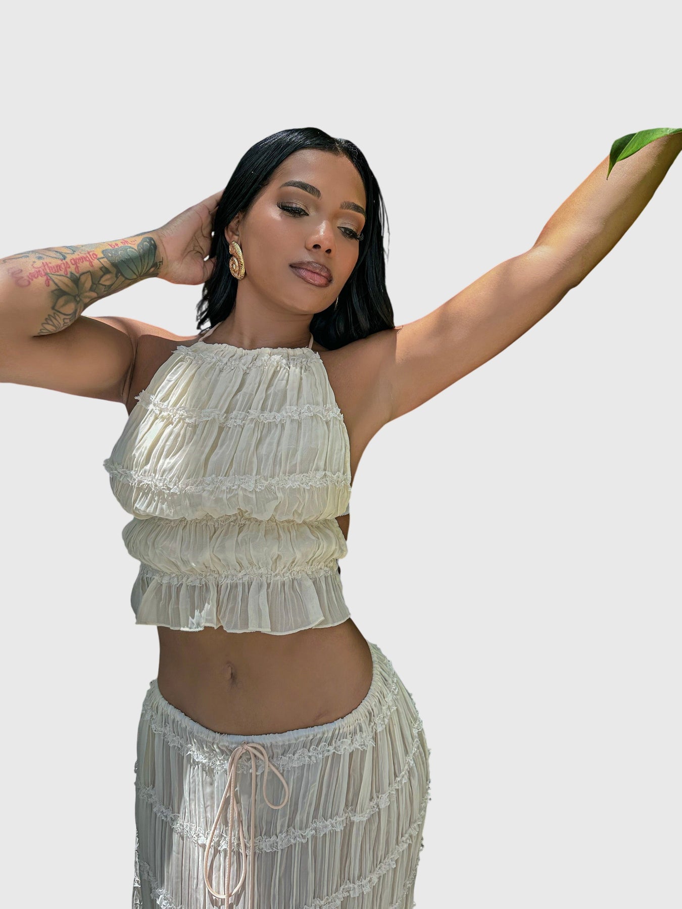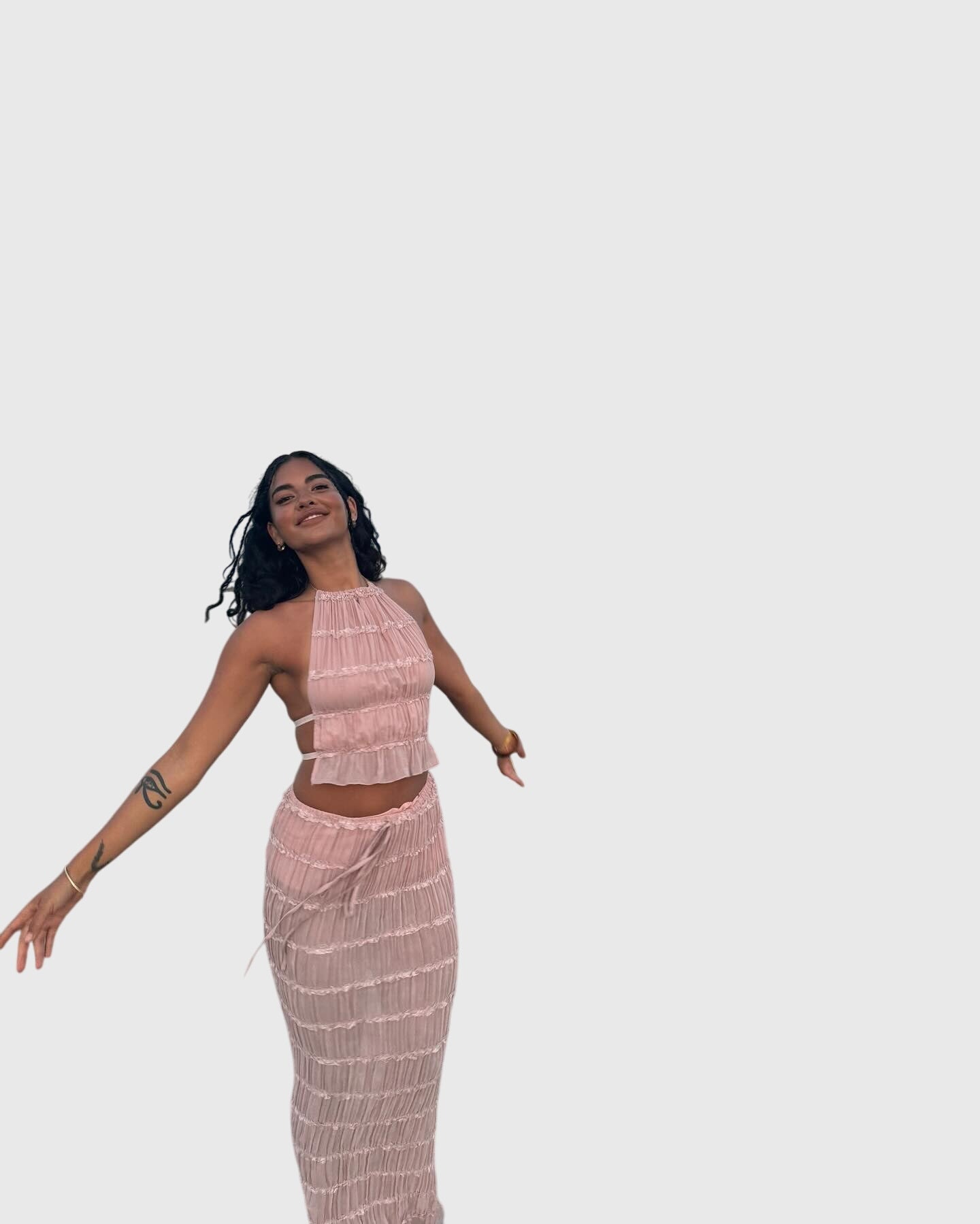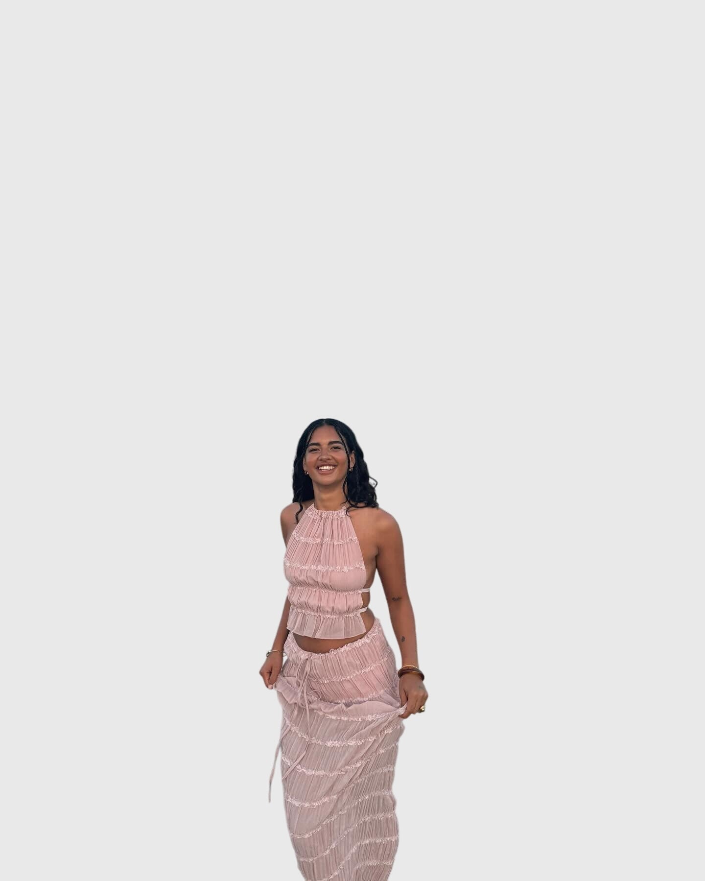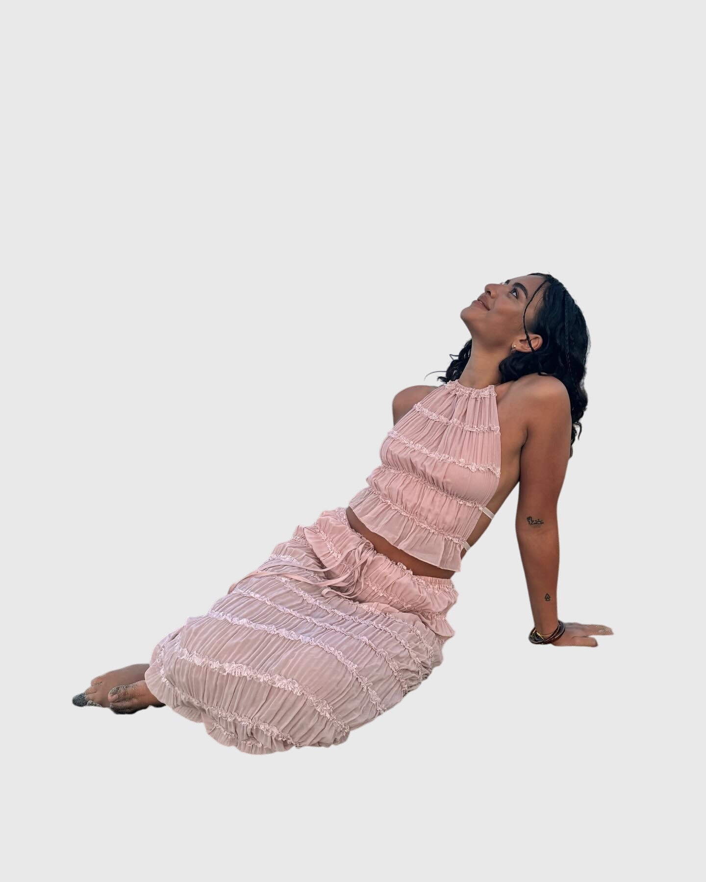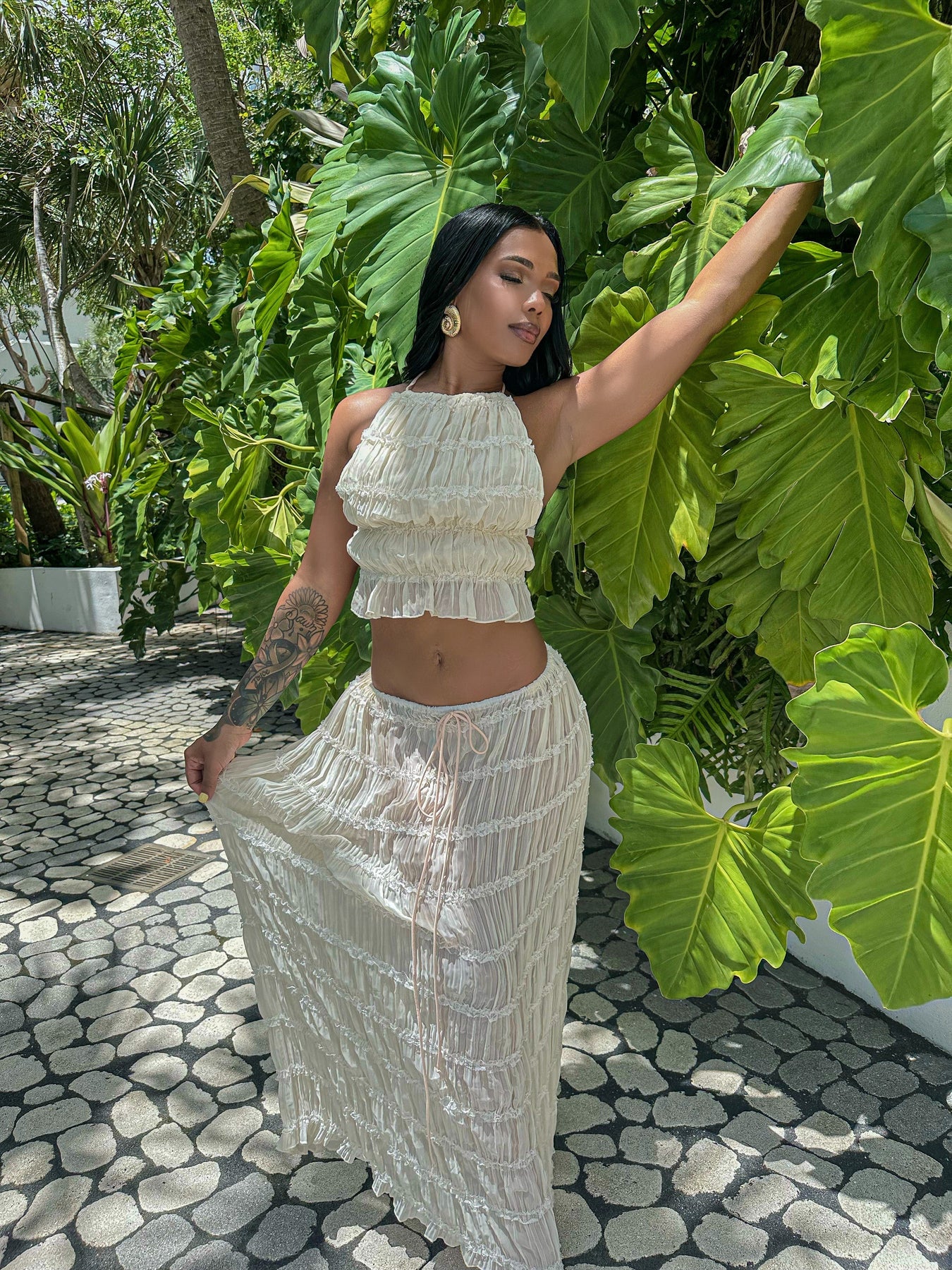 Playful pleats: the set features intricate pleating that adds movement and texture, creating a dynamic look that flows effortlessly with every step.