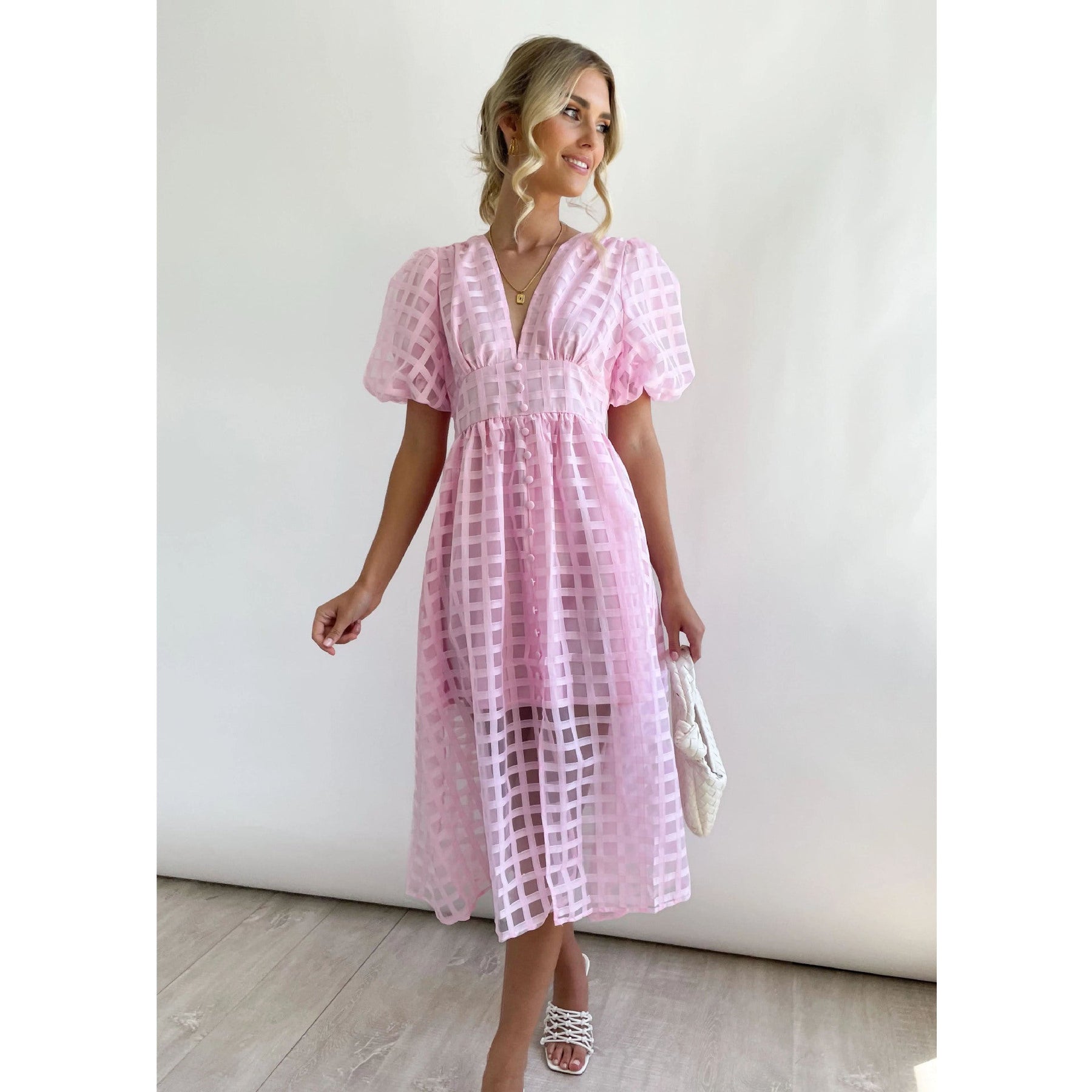 Make an impression with the Nadja Sheer Check Midi Dress, where structured design meets soft elegance. With its semi-sheer check pattern and voluminous puff sleeves, this flattering silhouette features a defined waist, delicate pleats, and a deep V-neck that brings a fresh, modern edge. Perfect for garden gatherings, chic soirées, or any moment that calls for standout style.