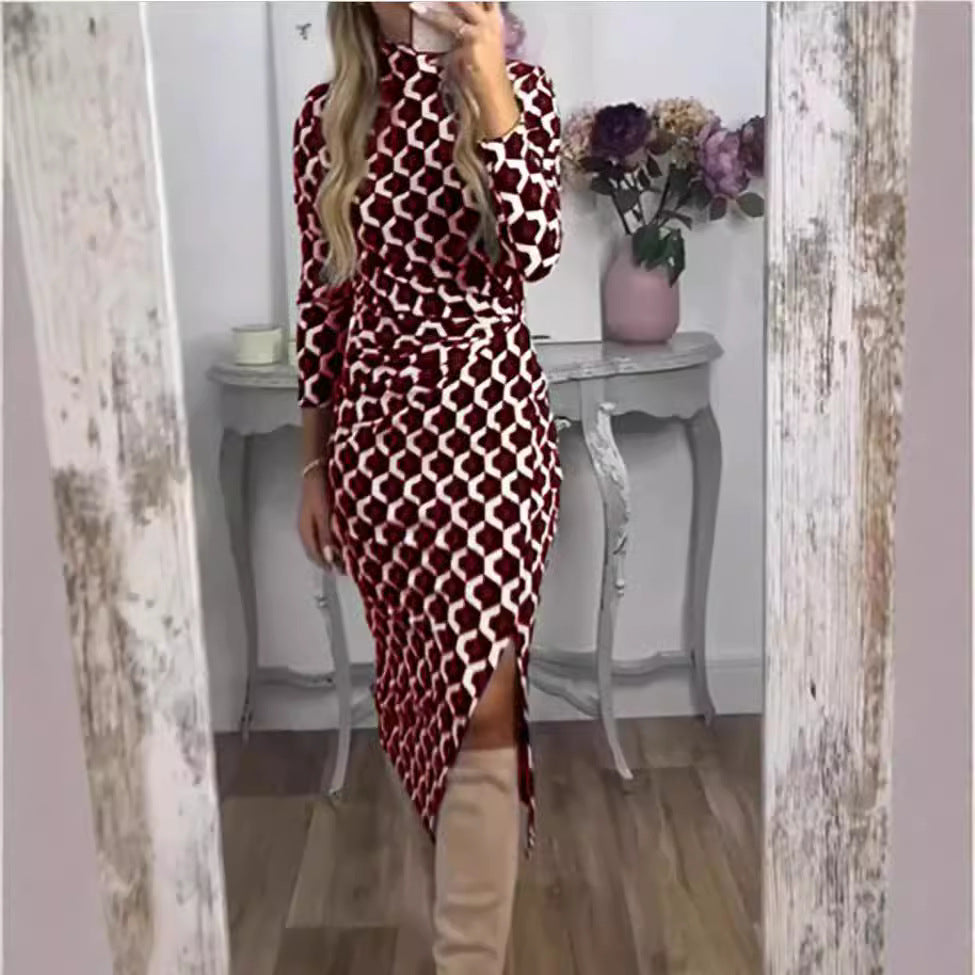 Make an unforgettable impression with the Yvaine Geometric High-Neck Midi Dress, where striking design meets refined tailoring. The high neckline and sculpted fit create a sleek silhouette, while the bold pattern and side slit bring a contemporary edge. Perfect from day to night, this dress flatters in all the right places and ensures you stand out with confidence.